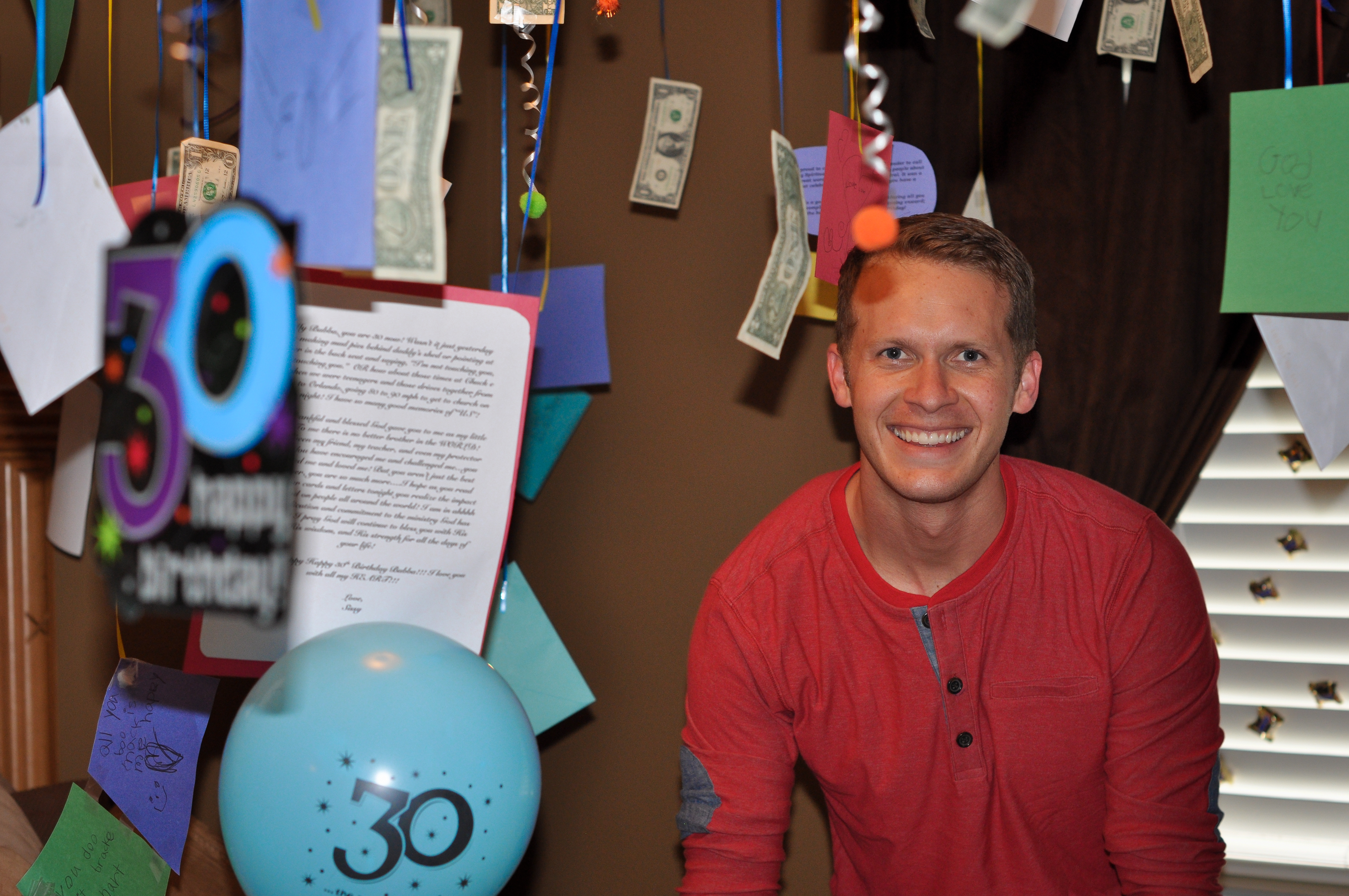 My brother, Robert Martin, is an amazing person and today is his 30th birthday! I wanted to do something special for his big 3-0 birthday….this is what I came up with…I asked family and friends to send cards and letters of encouragement to my home address two weeks ago. I collected them all and hung them in my brother’s room this afternoon, along with 30 $1 dollar bills, 30 snickers (on the window), and 30 decorative silly strings. Thank you everyone that helped make this possible with your cards, letters, and emails.