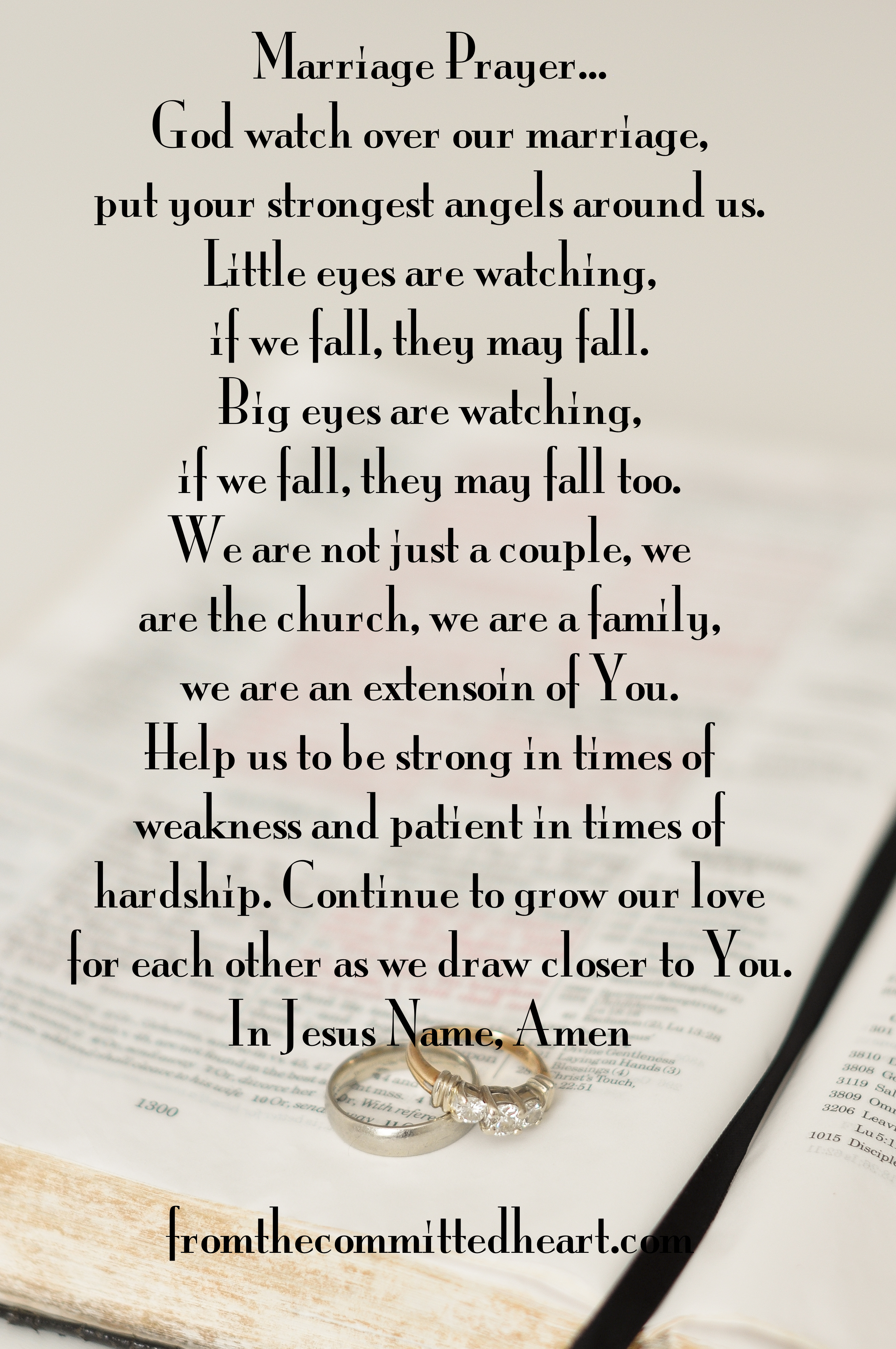Marriage Prayer Posted on January 11, 2014 by fromthecommittedheart Share this: Click to share on Pinterest (Opens in new window) Pinterest Click to share on Facebook (Opens in new window) Facebook Click to share on X (Opens in new window) X Like Loading... Related