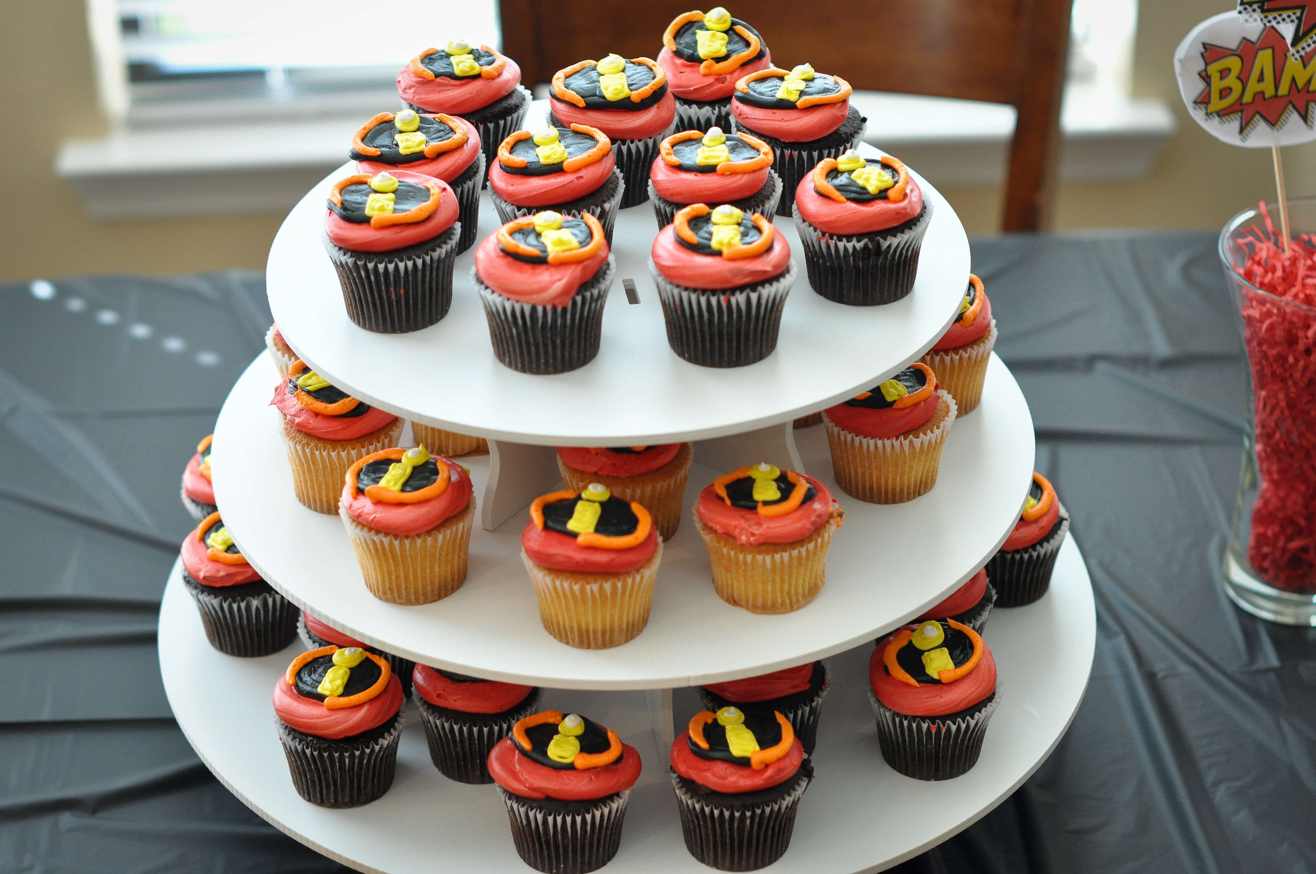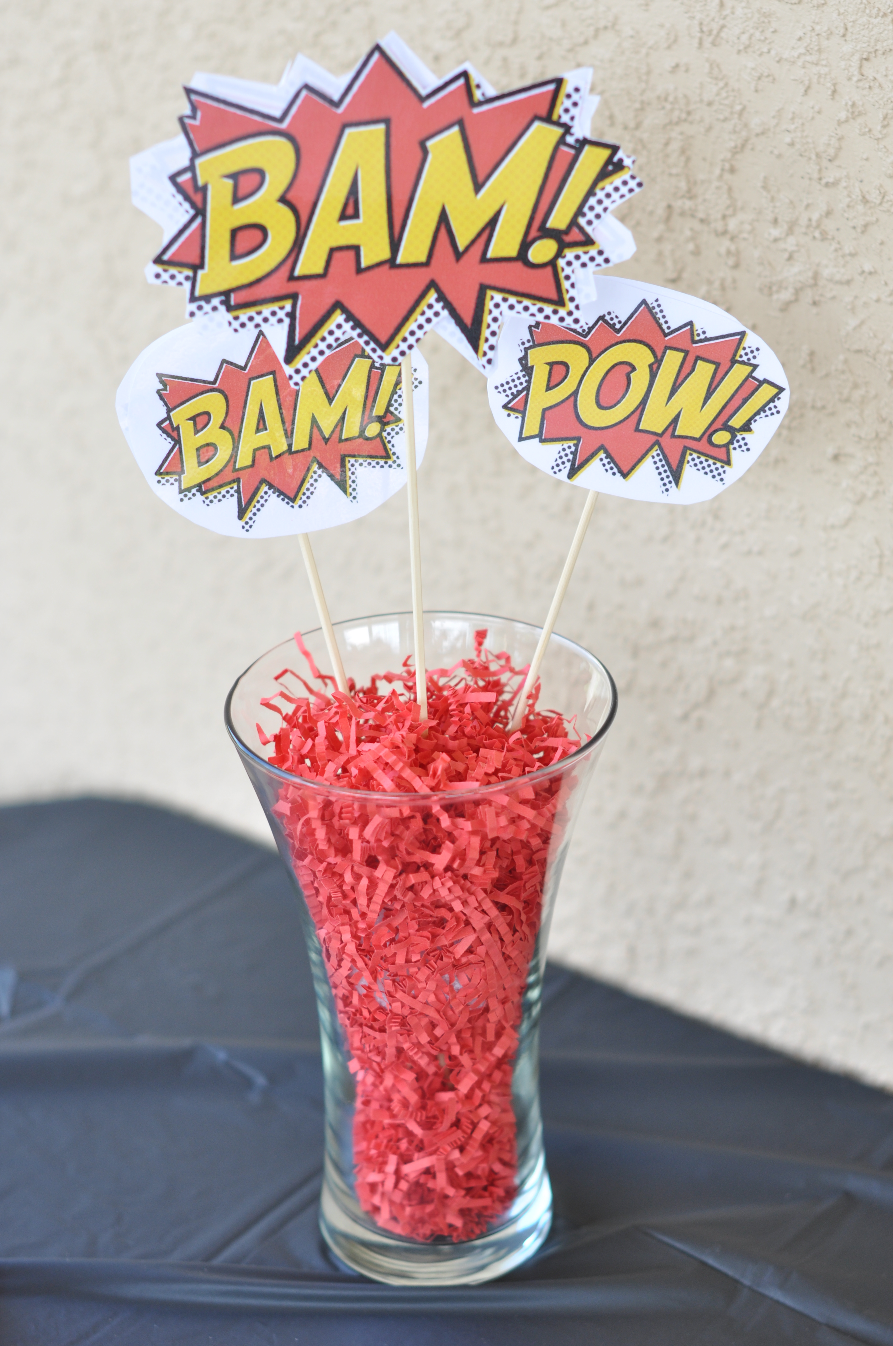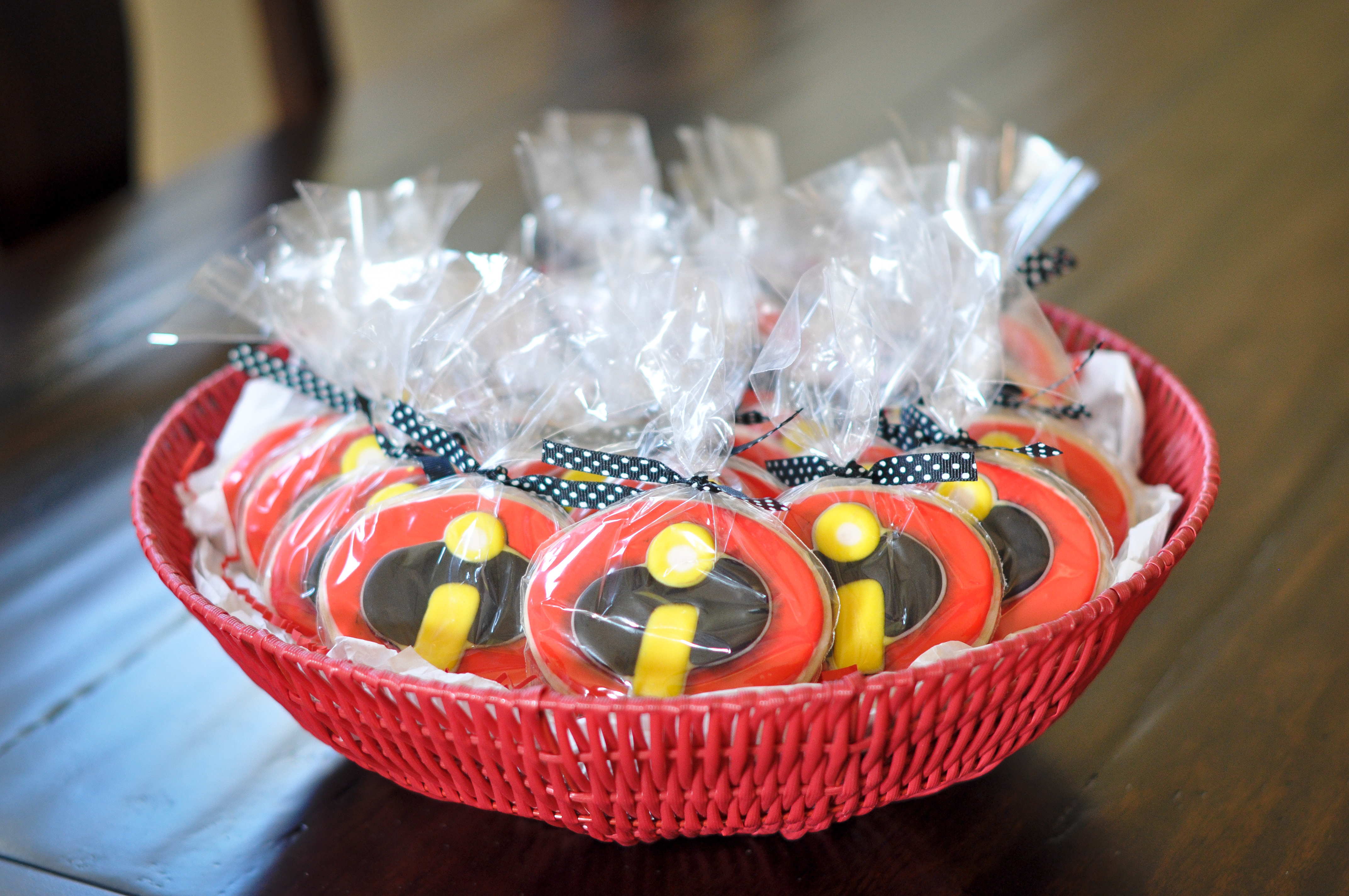 Instead of making goodie bags, I purchased these reusable glass candy jars to hand out as favors to all the friends that attended the party.