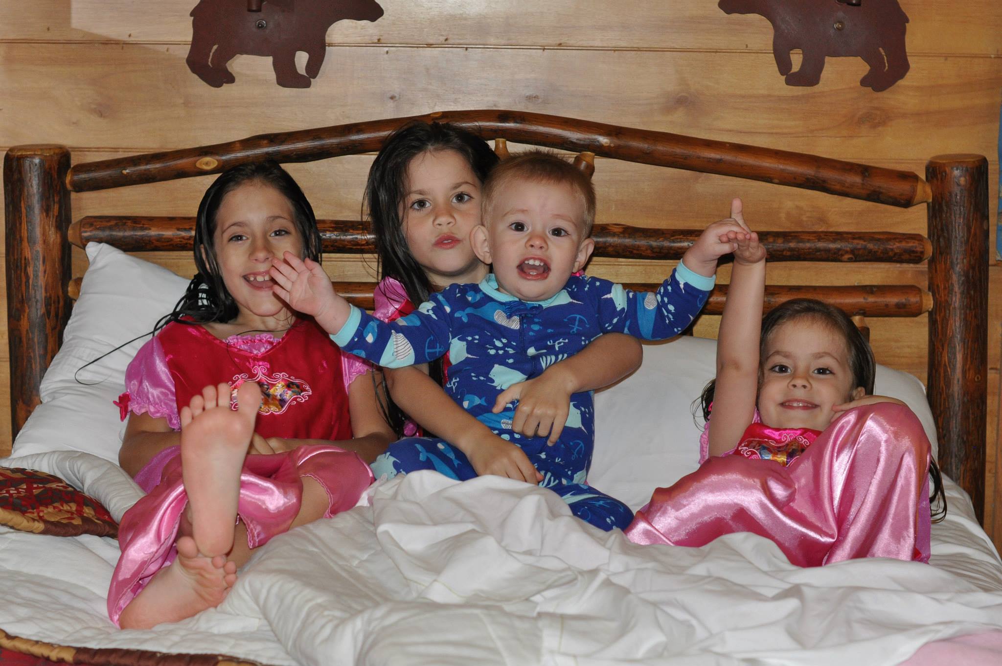It was 7:30pm and the night was young. Daddy yelled, “Let’s go swimming!” I am so glad we did because that was the one and only time the girls were well enough to swim. The resort had two different play areas at the pool one for kids shorter than 48 inches and one for the bigger kids. The Meadow Swimmin’ Pool, featured a 67-foot-long corkscrew waterslide…Victoria and Alayna had a blast going down the slide time and time again.